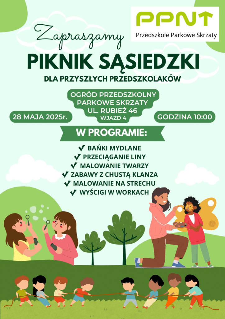 Our Parkowe Skrzaty PPNT Kindergarten cordially invites entire families to a Neighbourhood Picnic. For future kindergarteners, this will be a great opportunity to have fun together, and for parents, it will be a chance to spend time together and get to know the atmosphere of the facility better.