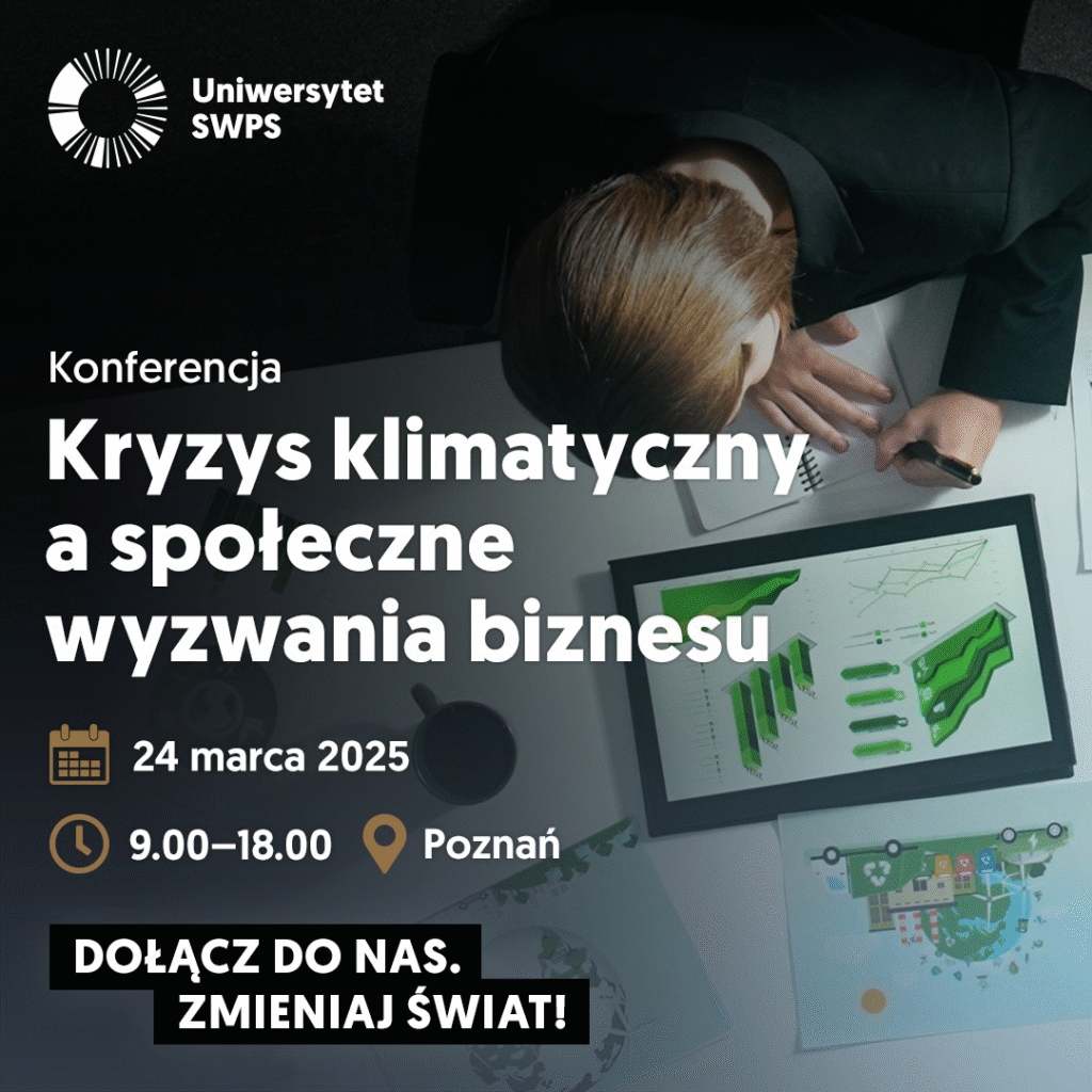 As co-organisers, we invite you to a free conference on climate challenges and their impact on business! The event, entitled “The climate crisis and social challenges for business”, will take place on 24 March 2025 at the Faculty of Psychology and Law in Poznań, SWPS University.