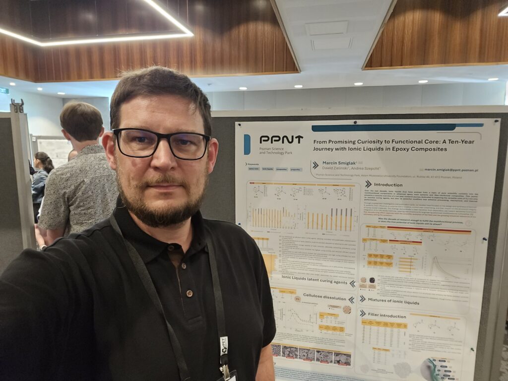 Ponadto, w ramach sesji posterowej, Zespół Syntez Materiałowych zaprezentował również swoje dokonania, głównie z zakresu niedawno bronionej pracy doktorskiej dr Dawida Zielińskiego. Tematyka dotyczyła zastosowań innych rodzajów cieczy jonowych w procesach wytwarzania, utwardzania i modyfikacji właściwości materiałów kompozytowych. Tytuł posteru brzmiał „From Promising Curiosity to Functional Core: A Ten-Year Journey with Ionic Liquids in Epoxy Composites”